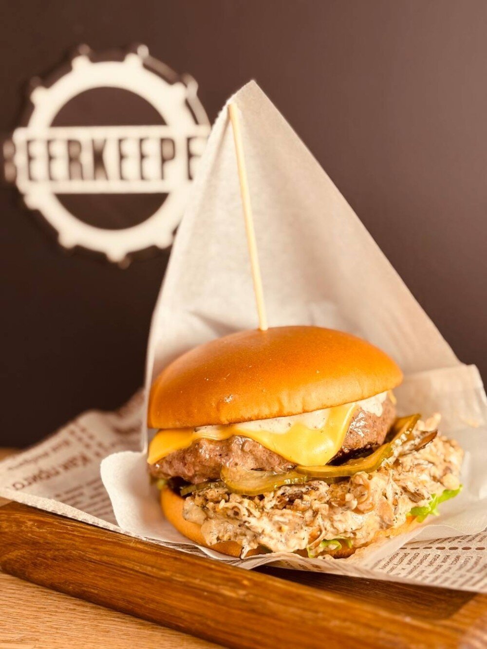 Мраморная говядина, ароматное грибное рагу из смеси вешенок и шампиньонов, хрустящие малосольные огурцы и мягкая бриошь. Рекомендуем заказывать в пите.